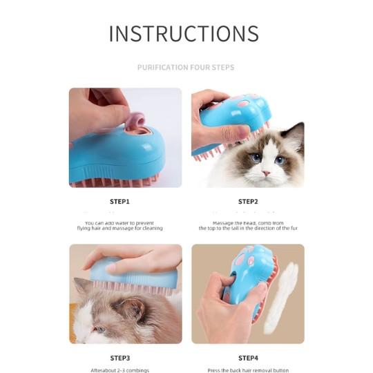 4-IN-ONE PET GROOMING BRUSH: Revolutionize your pet's grooming with this innovative steam massage hair brush designed to combine the benefits of a traditional pet brush with the enhancing effects of steam and UV light. The innovative UV light design eliminates harmful bacteria and promotes a healthier coat for your furry friend. This all-in-one grooming tool not only detangles and smoothens fur but also adds moisture to prevent dryness and skin irritation.